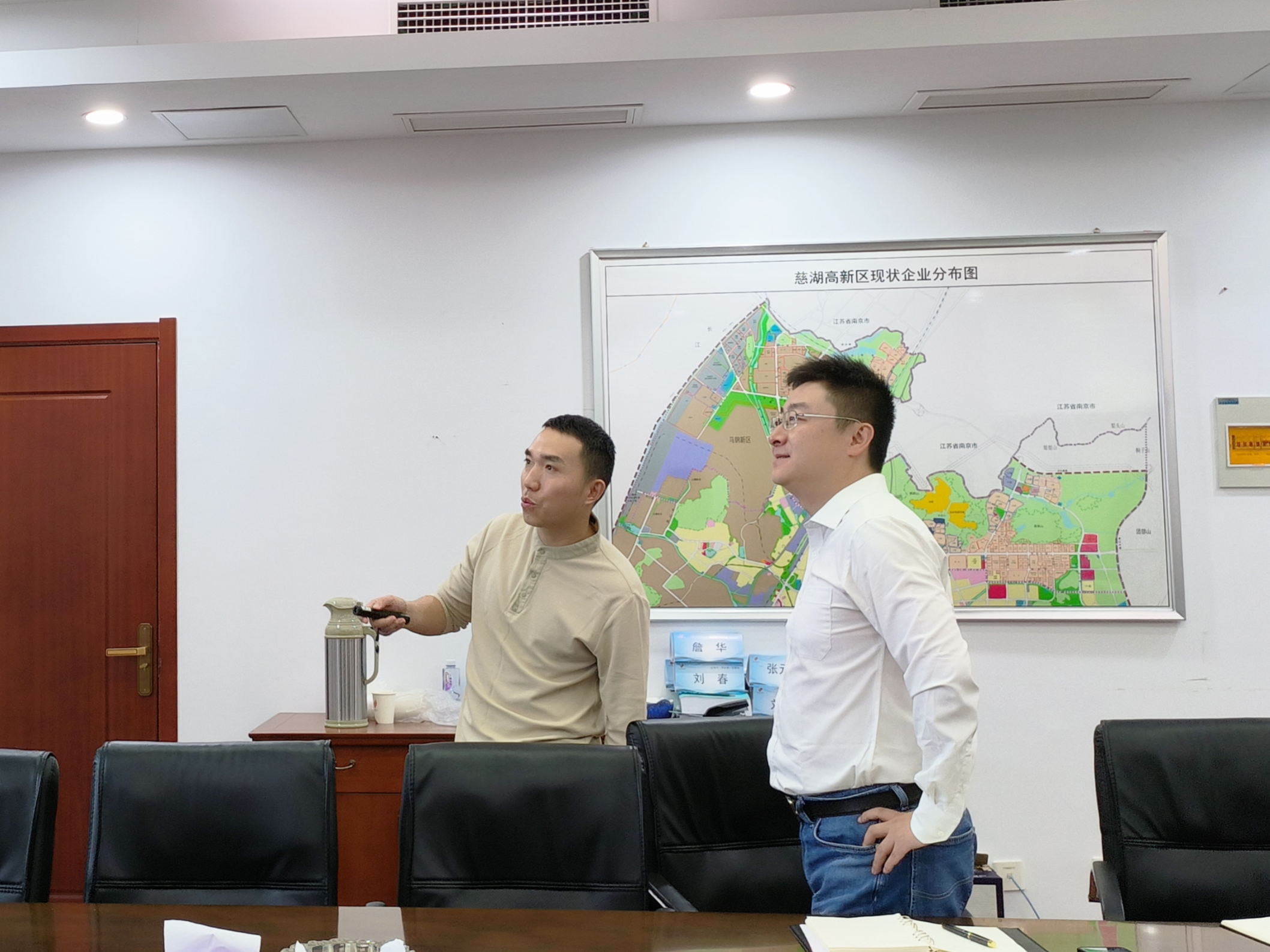 双方在会议室围绕政策细则深入交流,郭健结合“慈湖高新区现状企业分布图”,清晰阐述区域产业布局与招商优势。此次政策解读为华钜峰在马鞍山的产业发展与布局提供了重要参考,助力企业把握发展新机遇。